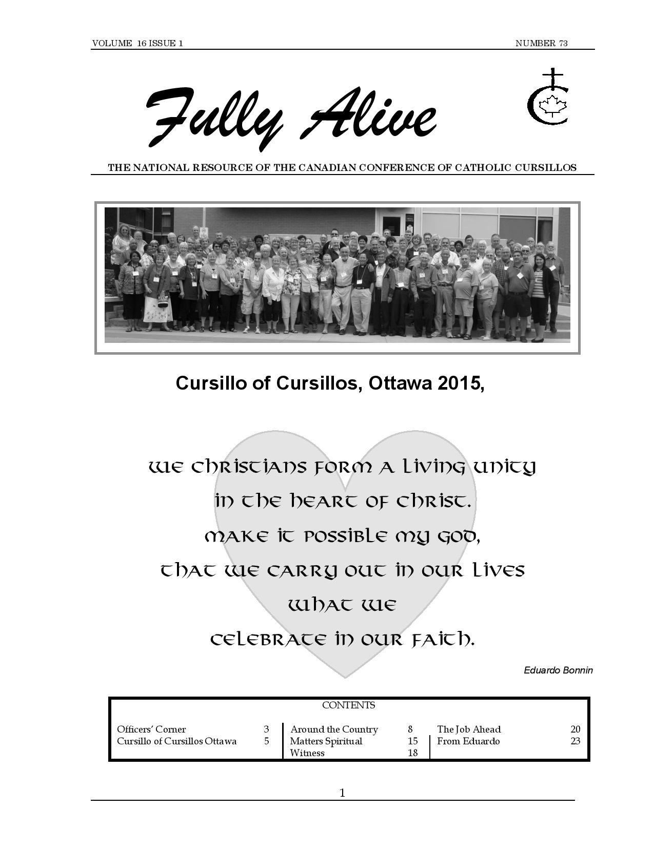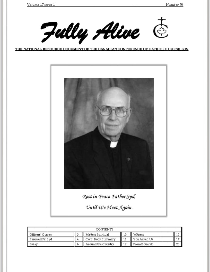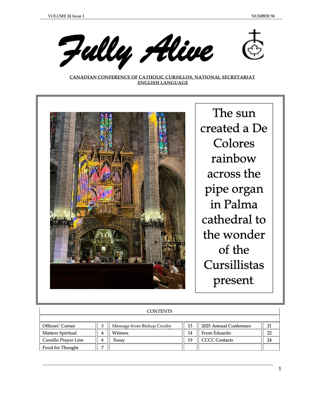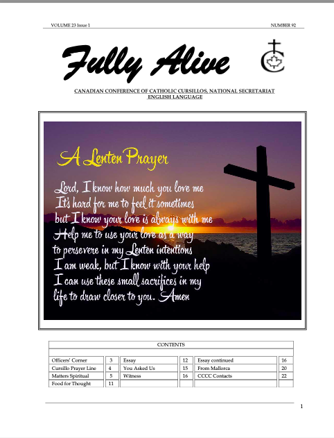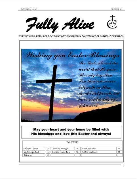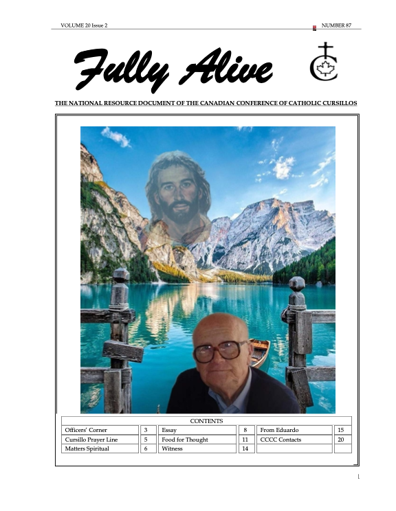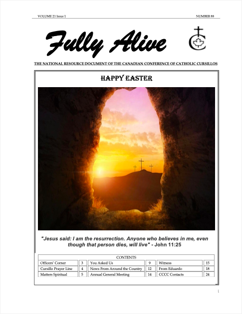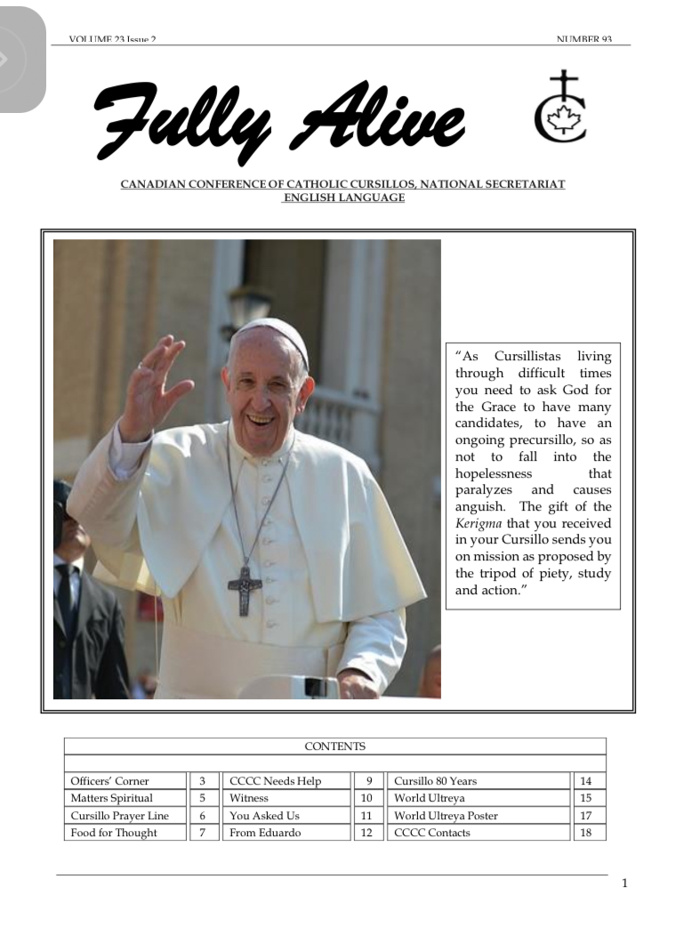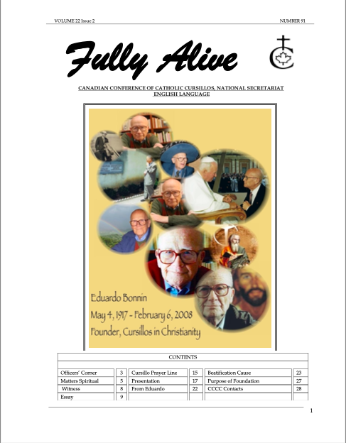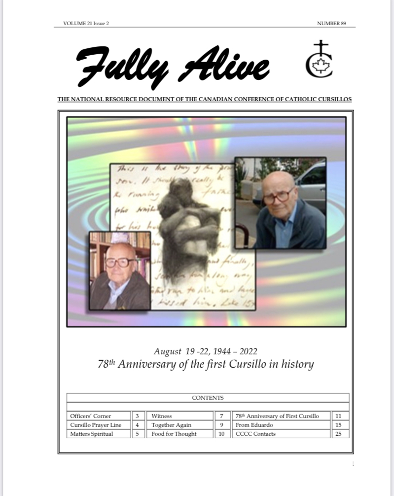 Fully Alive is published three times a year. It is our hope that the contents of Fully Alive are becoming a valuable resource document for the Schools of Leaders across the country. Each issue contains at least one topic pertaining to the Foundational Charism of the Cursillo Movement. Also included are short reports from the diocesan Movements across the country. Submissions to Fully Alive are welcomed, especially for the columns; You Asked Us, Essay, Witness, and From Our Readers. In addition, we welcome the news from your diocesan Movements. Anniversaries or special events that you would like to have included should be submitted at least three months prior to the event.