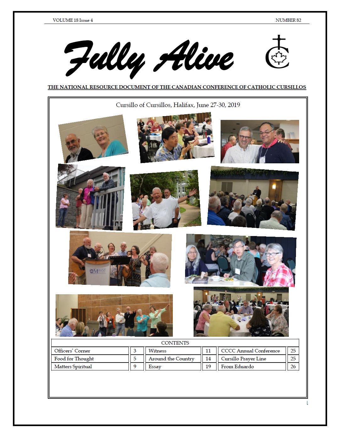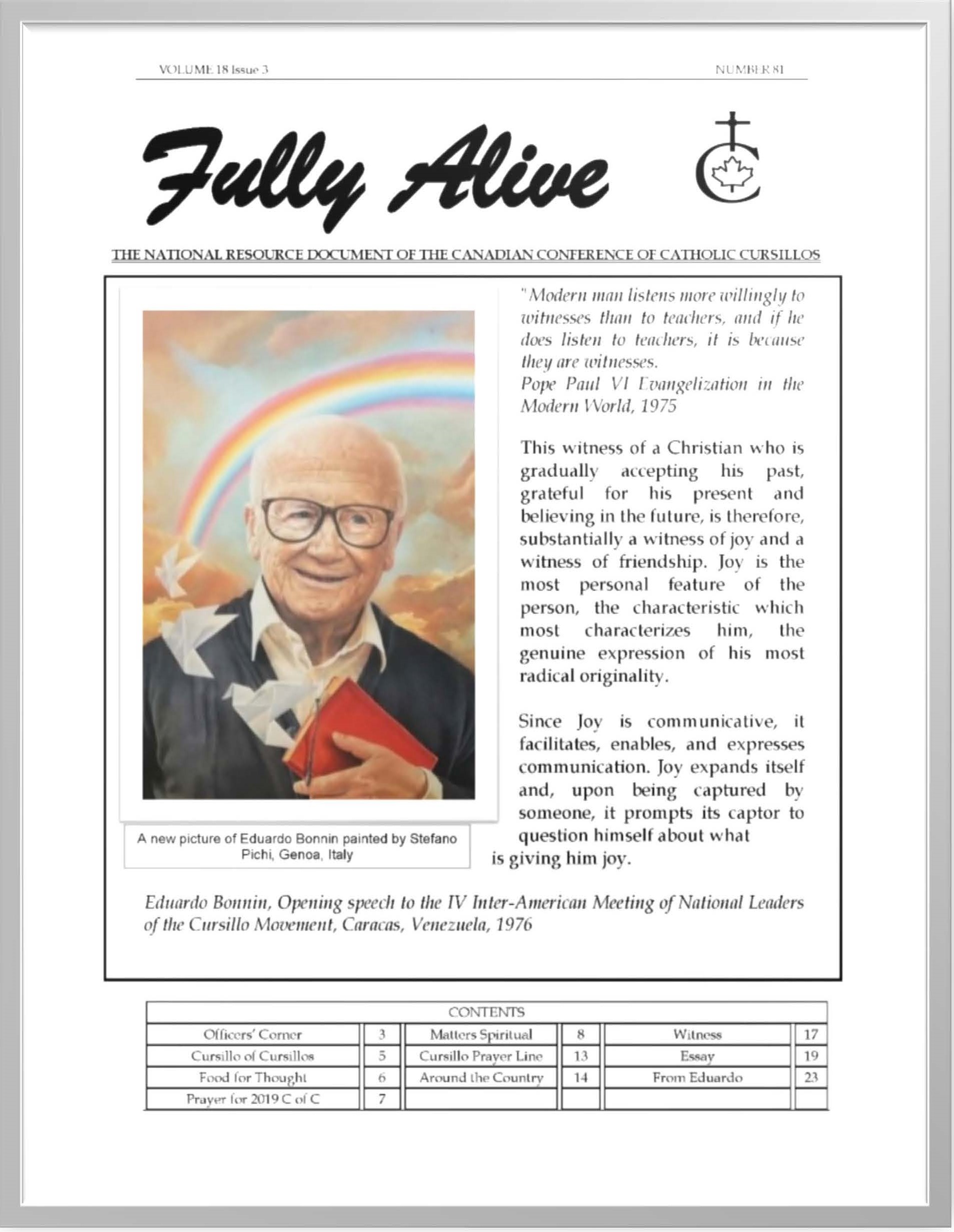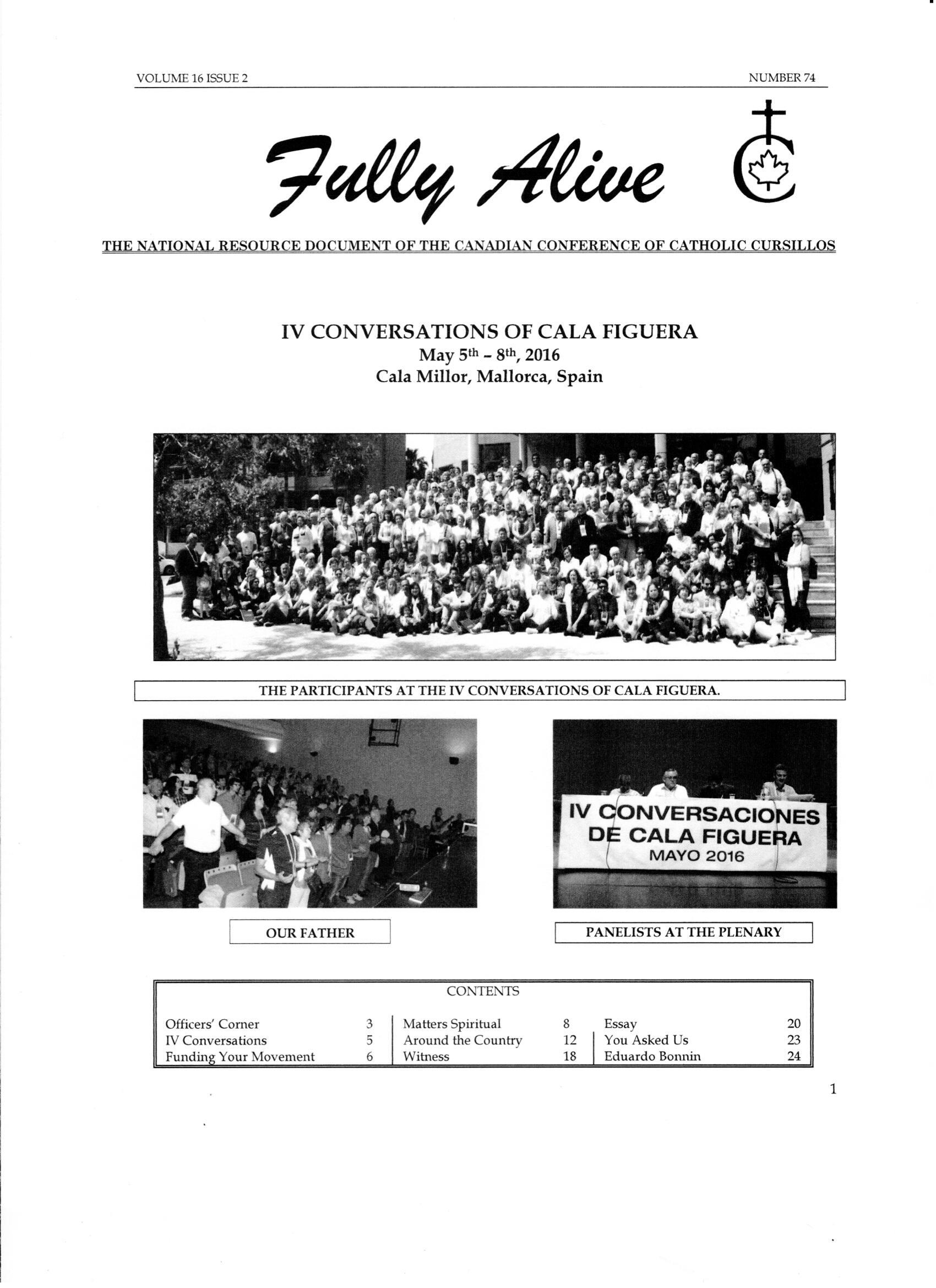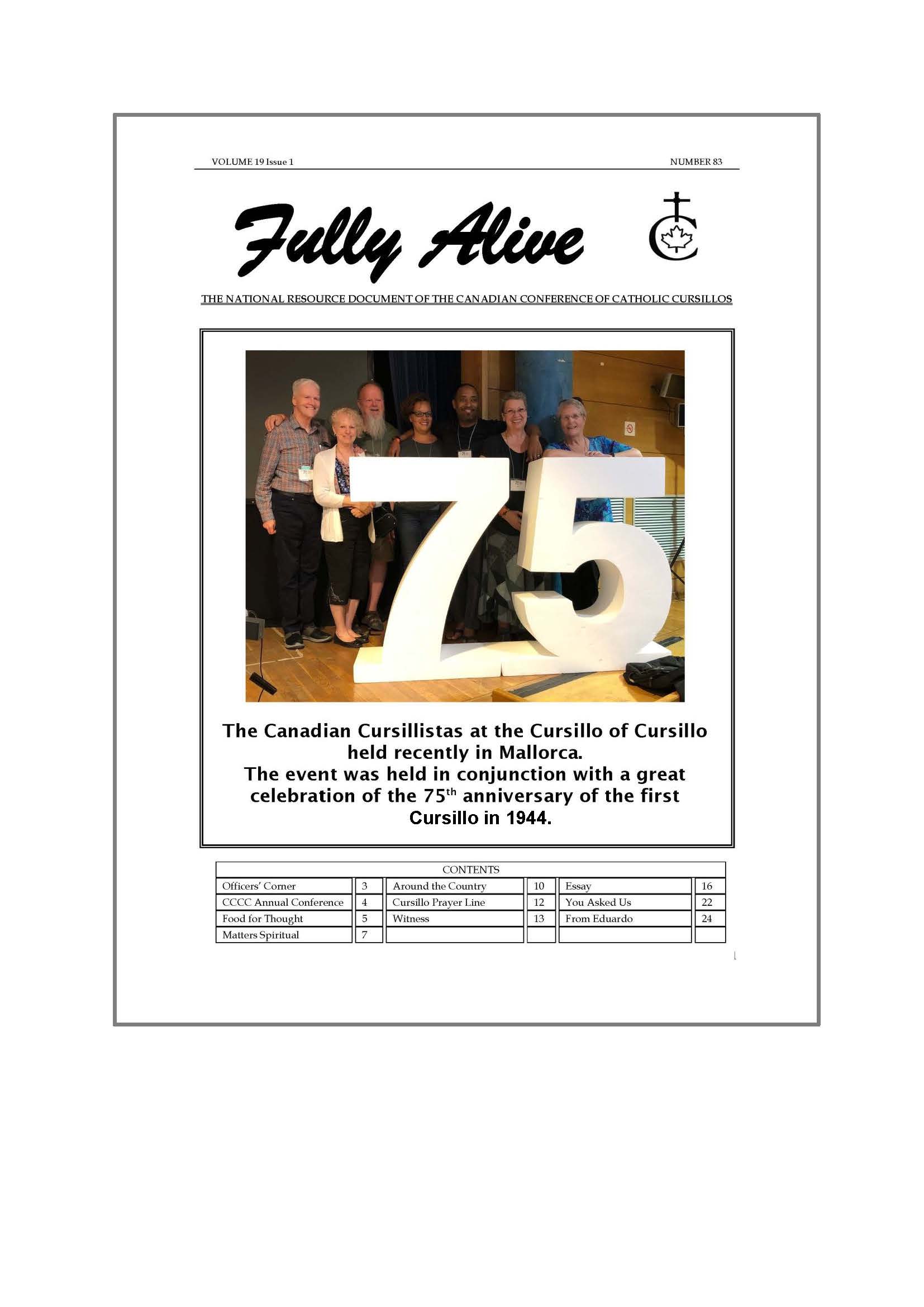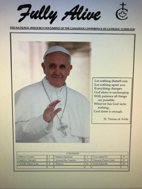Fully Alive is published three times a year. It is our hope that the contents of Fully Alive are becoming a valuable resource document for the Schools of Leaders across the country. Each issue contains at least one topic pertaining to the Foundational Charism of the Cursillo Movement. Also included are short reports from the diocesan Movements across the country. Submissions to Fully Alive are welcomed, especially for the columns; You Asked Us, Essay, Witness, and From Our Readers. In addition, we welcome the news from your diocesan Movements. Anniversaries or special events that you would like to have included should be submitted at least three months prior to the event.