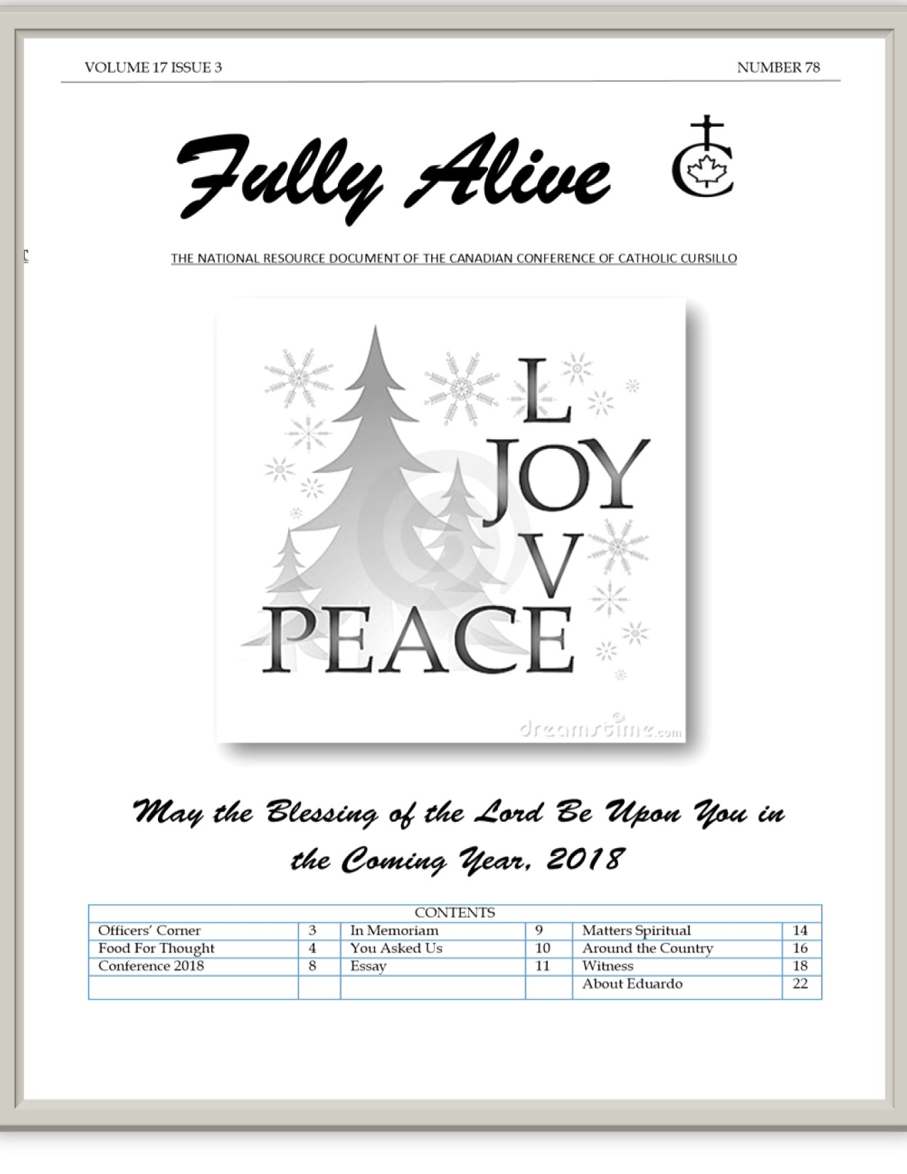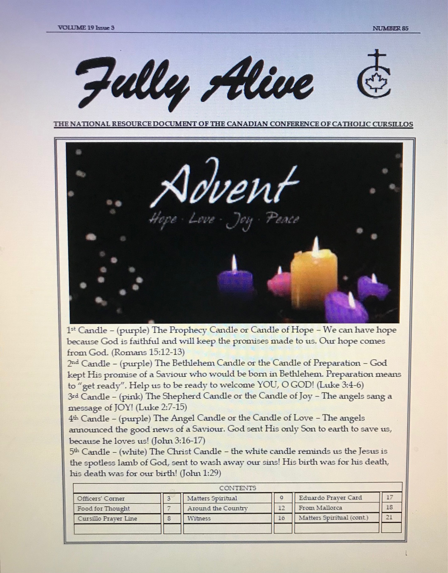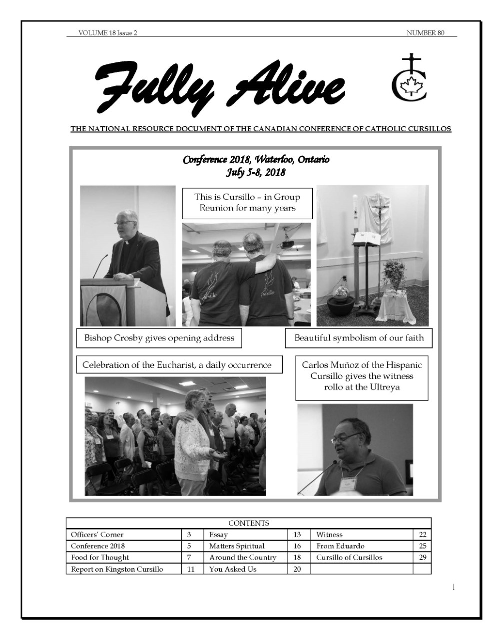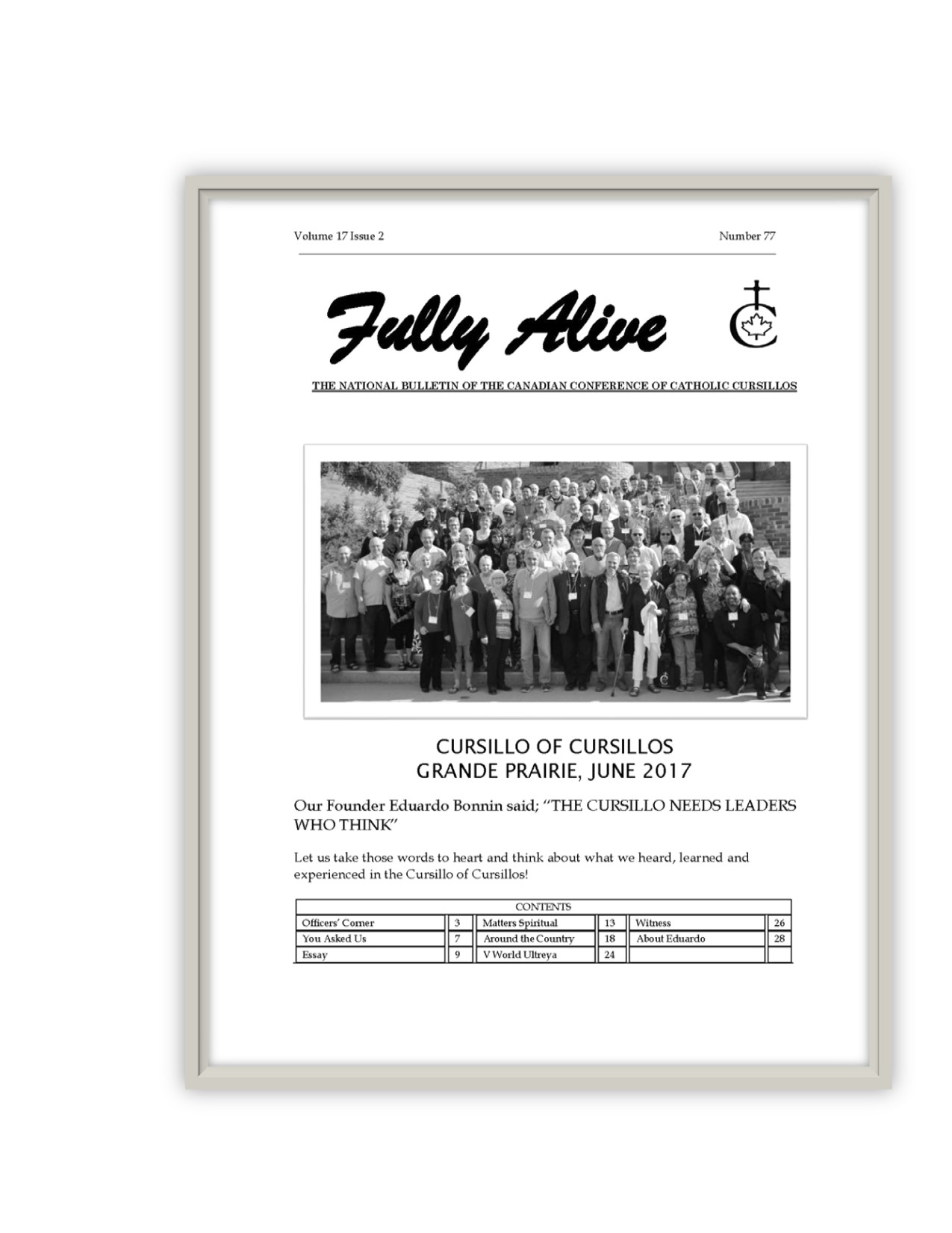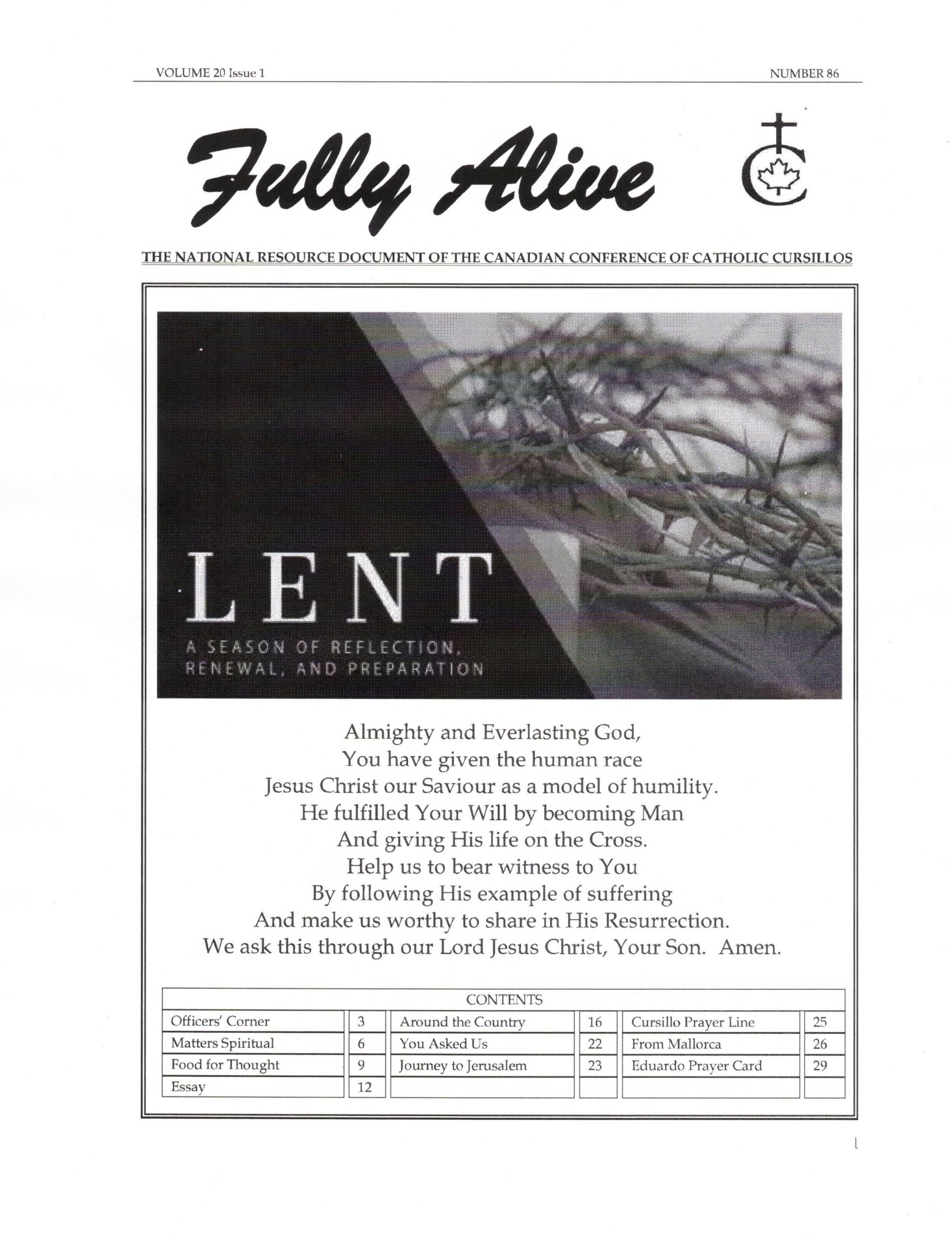 Fully Alive is published three times a year. It is our hope that the contents of Fully Alive are becoming a valuable resource document for the Schools of Leaders across the country. Each issue contains at least one topic pertaining to the Foundational Charism of the Cursillo Movement. Also included are short reports from the diocesan Movements across the country. Submissions to Fully Alive are welcomed, especially for the columns; You Asked Us, Essay, Witness, and From Our Readers. In addition, we welcome the news from your diocesan Movements. Anniversaries or special events that you would like to have included should be submitted at least three months prior to the event.